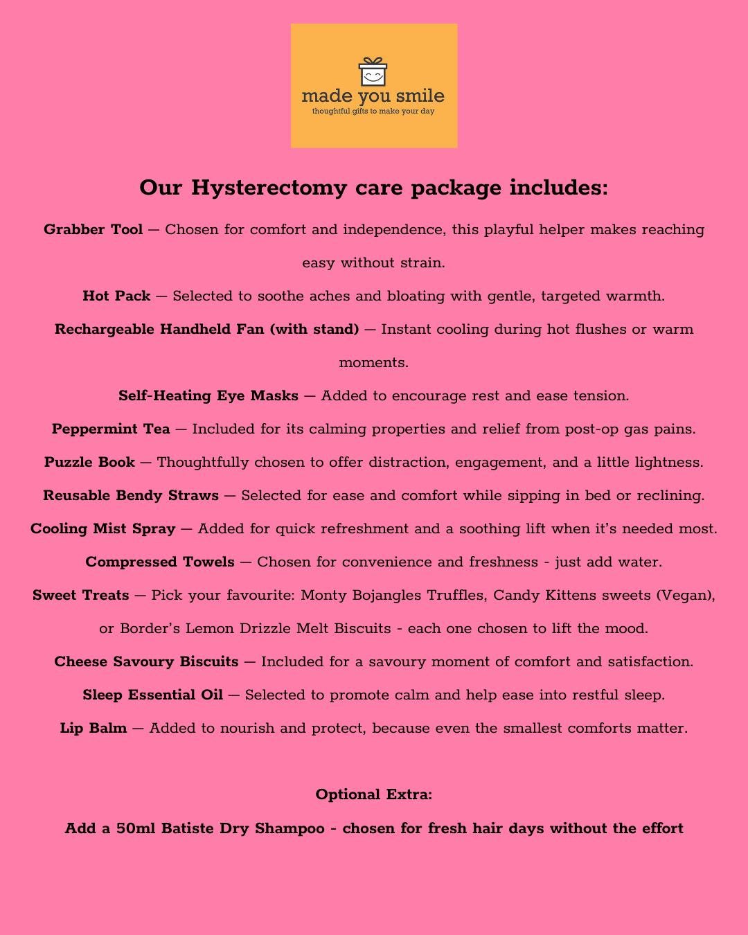 In 2024, at the age of 42, I had a hysterectomy and oophorectomy, a moment that changed everything physically, emotionally and mentally. During recovery, I discovered how much small, thoughtful items could help: a grabber tool to avoid bending, bendy straws for sipping in bed, a handheld fan for hot flushes. That’s when this care package was born - not as a generic gift, but as something built from experience. Every detail reflects what I needed most, and what I wish someone had sent me. It’s a way to say, “I understand,” without needing many words.