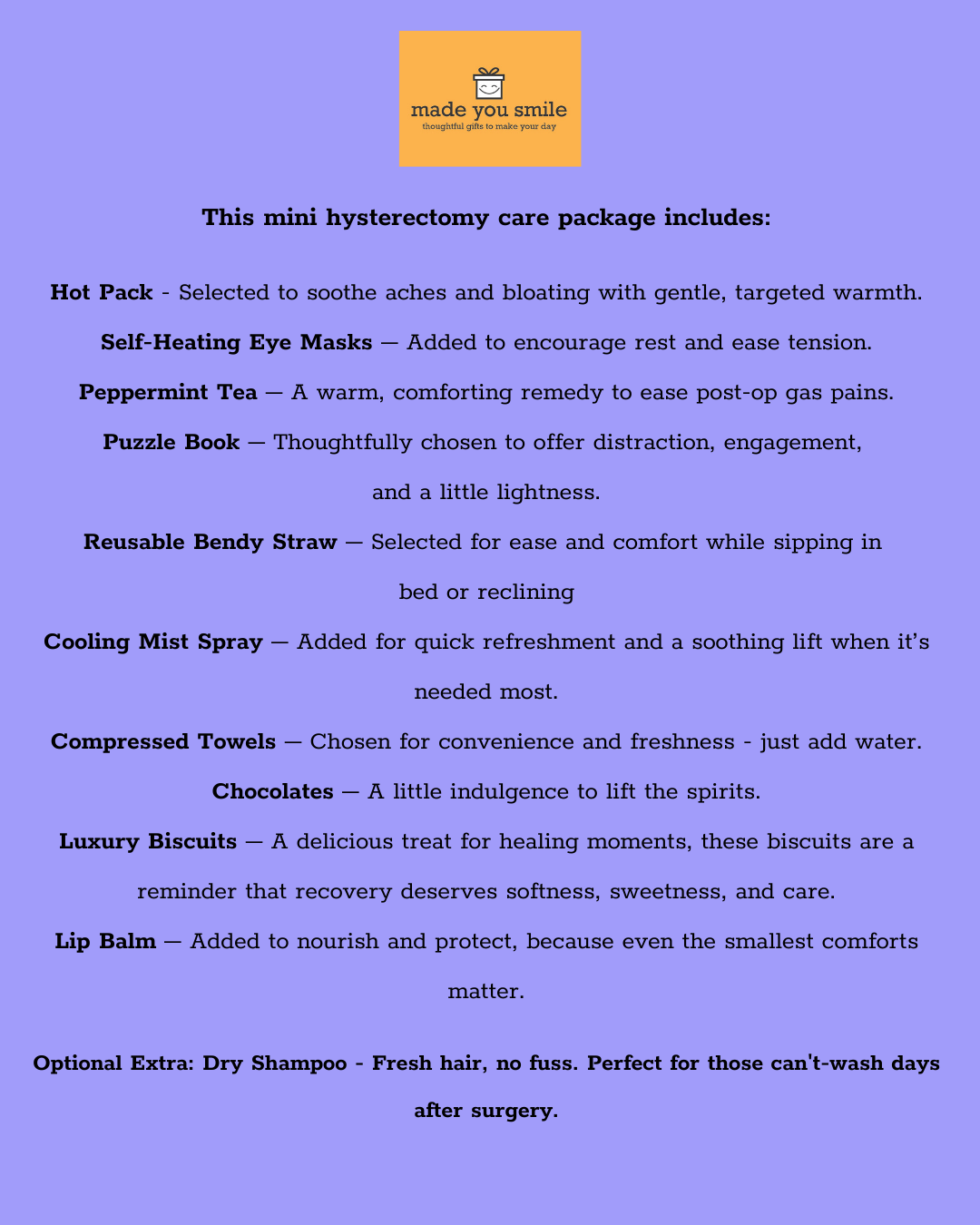 When someone’s healing after a hysterectomy, a thoughtful gesture can bring real comfort. This Mini Hysterectomy Care Package is a gentle way to say “You’re not alone.” Each item has been carefully chosen to offer calm, care and a moment of relief during recovery.